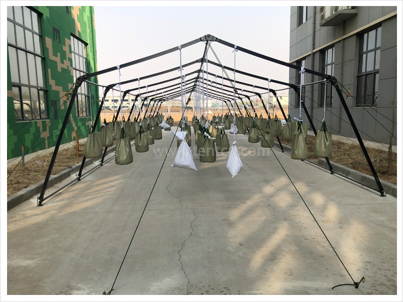 帳篷為斜坡式、外篷雙層結(jié)構(gòu),夏季隔熱、通風(fēng)性能良好,冬季保溫、密封性能良好。篷架采用榀架折疊、橫桿插接機(jī)構(gòu),零部件品種少,易于管理。篷體窗墻面積比大,室內(nèi)通風(fēng)采光良好,篷體設(shè)有斜拉式窗蓋和遮篷式通風(fēng)窗蓋,遮陽(yáng)、遮雨功能良好。帳篷配有防潮地布、防蚊紗門和紗窗,居住性好。帳篷可以多方式任意組合聯(lián)接。